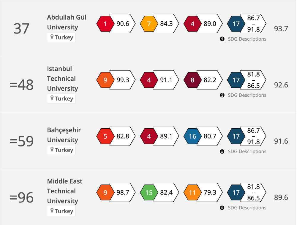 AGÜ’nün ardından İstanbul Teknik Üniversitesi (İTÜ) 48’inci, Bahçeşehir Üniversitesi 59’uncu ve Orta Doğu Teknik Üniversitesi (ODTÜ) 96’ncı sırada yer aldı. Ancak Türkiye’den en yüksek dereceyi elde ederek zirvede yer alan üniversite Abdullah Gül Üniversitesi oldu.