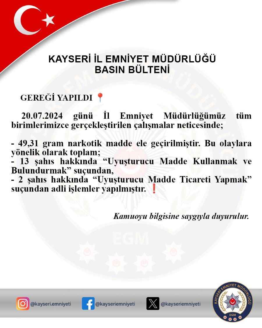 Kayseri'de Geniş Çaplı Narkotik Operasyonu: 15 Şahıs Hakkında İşlem Yapıldı