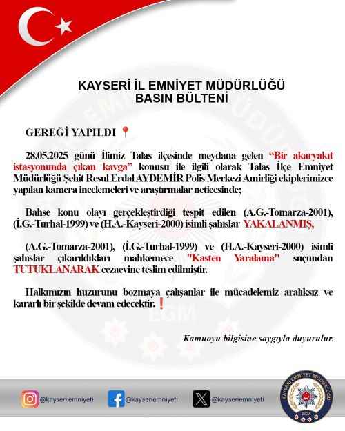 Talas’ta bir akaryakıt istasyonunda çıkan kavgada üç kişi gözaltına alındı. Emniyet ekiplerinin titiz çalışması sonucu yakalanan şahıslar, "Kasten Yaralama" suçundan tutuklanarak cezaevine gönderildi